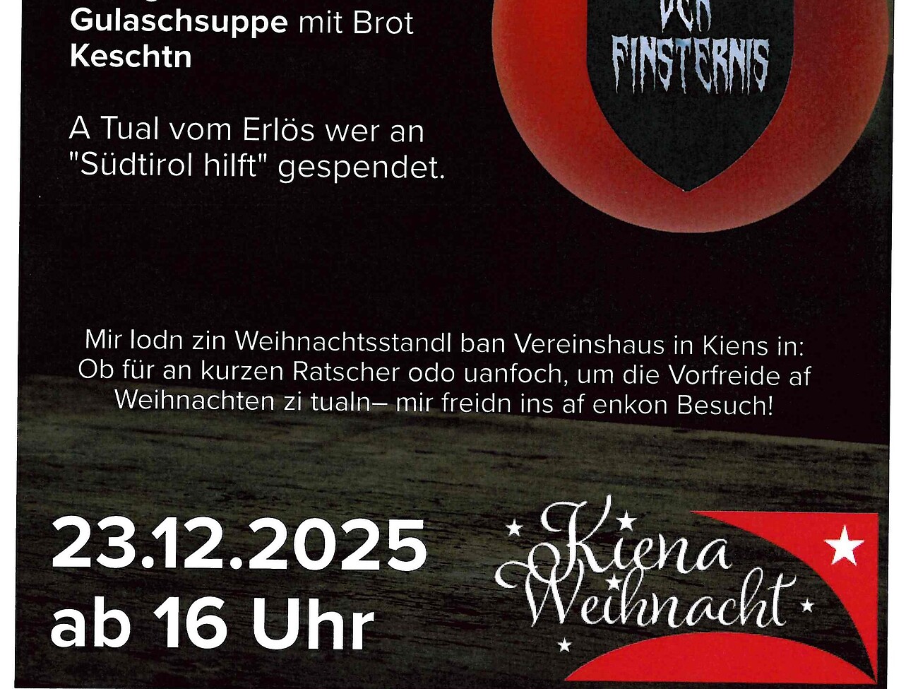 Am 23.12.2025 ab 16:00 Uhr beim Vereinshaus in Kiens. Kommt vorbei und genießt einen gemütlichen Nachmittag mit weihnachtlicher Stimmung, gutem Essen und vielen Überraschungen!