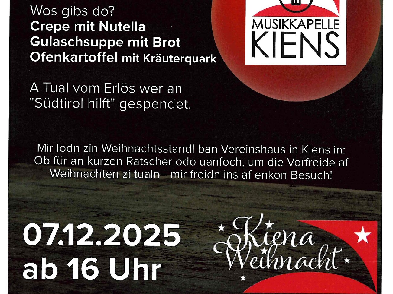 Die Musikkapelle Kiens lädt euch herzlich zum Kiener Weihnachtsmarkt ein!