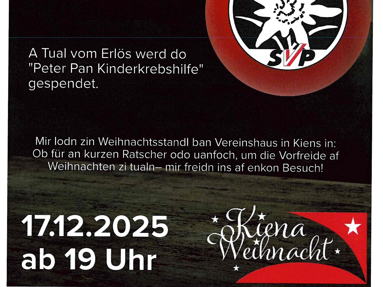 Die SVP- Ortsgruppe Kiens lädt euch herzlich zum Kiener Weihnachtsmarkt ein!