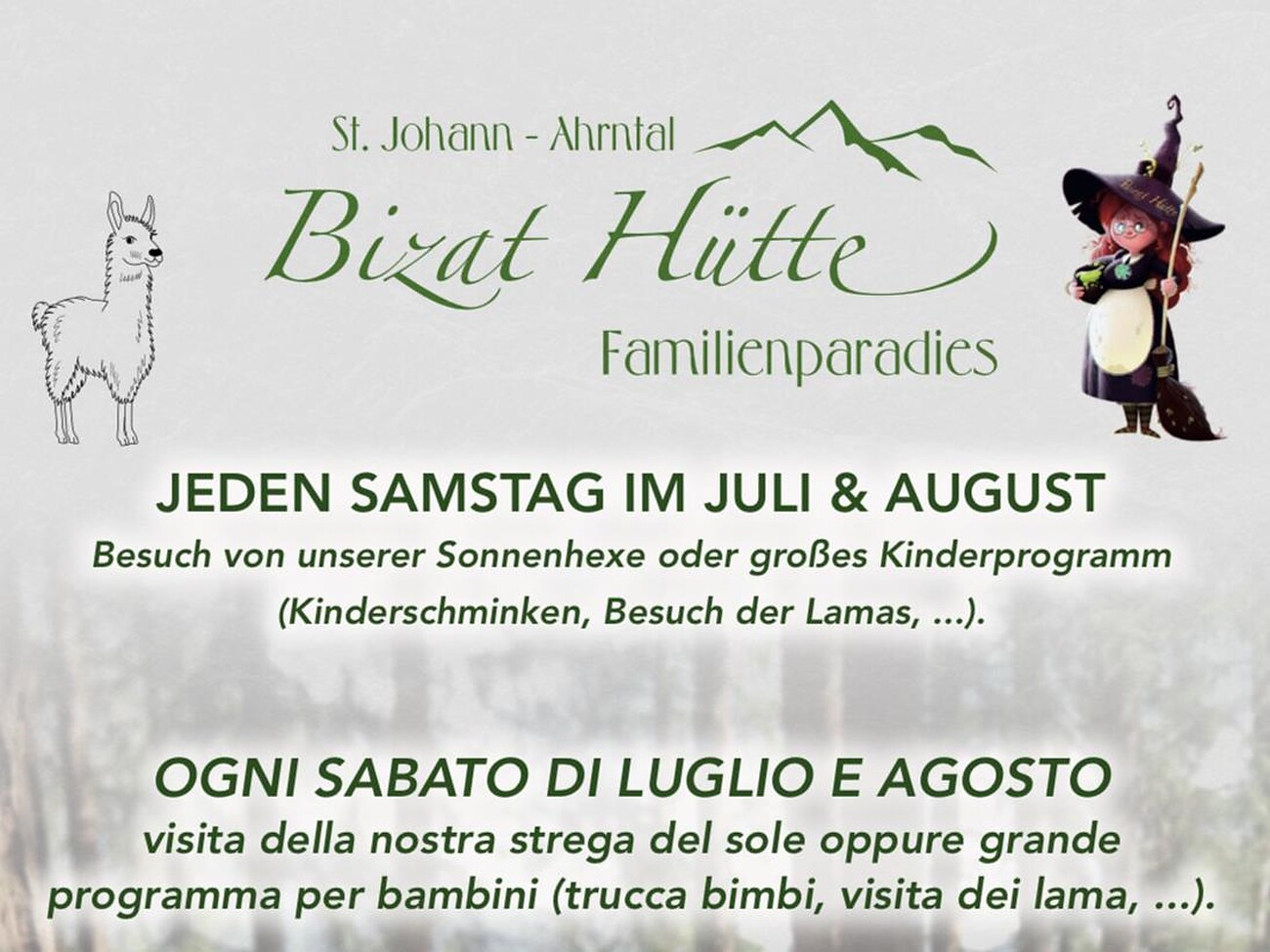 jeden Samstag im Juli und August: Besuch von der Sonnenhexe oder großes Kinderprogramm (Kinderschminken, Besuch der Lamas, ...)