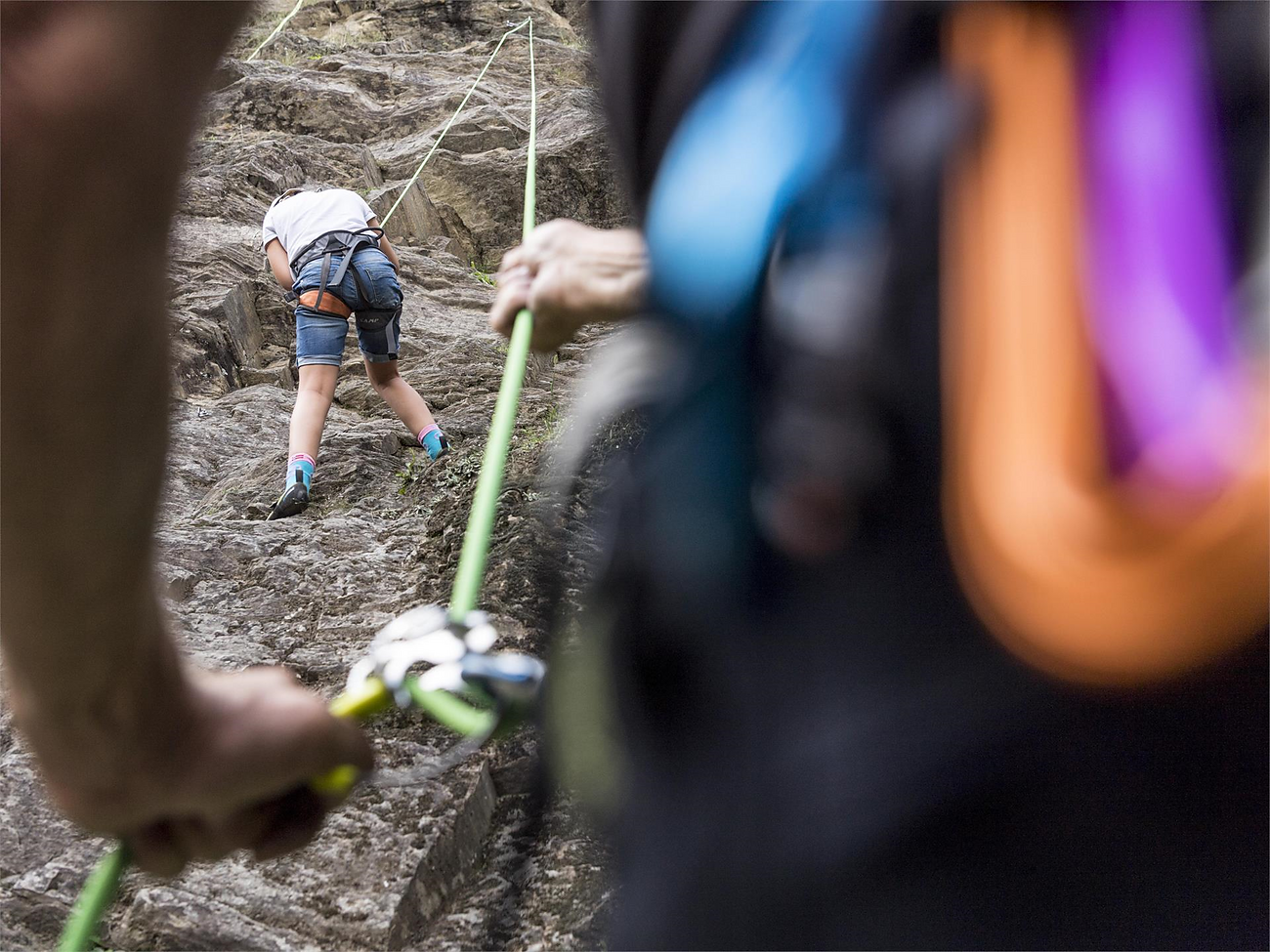 Gefahrlos lernen Kinder von 7-14 Jahren unter fachkundiger Anleitung eines staatlich geprüften Bergführers am Burgstallknott in Partschins klettern!
