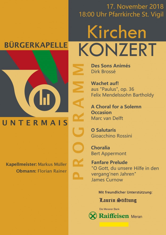 Bereits zum vierten Mal veranstaltet heuer die Bürgerkapelle ihr Kirchenkonzert zur Feier der heiligen Cäcilia. In der Pfarrkirche von Untermais wird allen Liebhabern der ausdrucksstarken Musik wieder hochwertige und eigens arrangierte Kirchenmusik für das Blasorchester geboten. Kapellmeister Markus Müller hat sich auch dieses Jahr stimmige Werke voller musikalischer Höhepunkte ausgesucht, allen voran die beeindruckende Komposition "A Choral for a Solemn Occasion" von Marc van Delft. Die Moderation durch das Konzert erfolgt wiederum von Pater Cyrill Greiter. Obmann Florian Rainer lädt zusammen mit den Musikanten der Bürgerkapelle herzlich zum Konzertbesuch ein, der Eintritt ist frei.