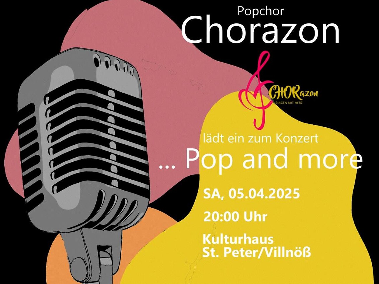 Der Popchor Chorazon lädt zum Konzert „Pop and more“ am Samstag, 5. April um 20.00 Uhr im Kultursaal St. Peter herzlich ein. Eintritt: freiwillige Spende.