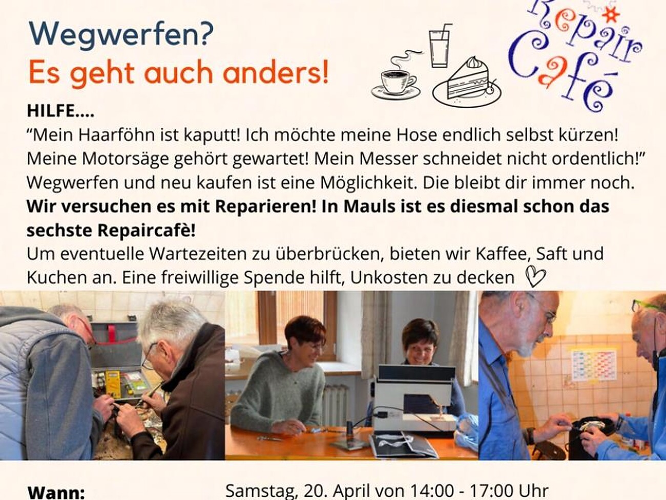 Wir versuchen es mit Reparieren! In Mauls ist es diesmal schon das sechste Repaircafè!
