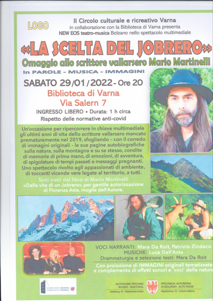 Un occasione per ripercorrere in chiave multimediale gli ultimi anni di vita dello scrittore vallarsero (mancato nel 2019) sfogliando con il corredo di immagini originali le sue pagine autobiografiche sulla natura, sulla montagna e su se stesso condite di memorie di prima mano, di emozioni di avventura, di spigolature di tempi passati e messaggi pregnanti Uno spettacolo rivolto agli appassionati di ambiente di toccanti vicende vere legate al territorio, a tutti. Lavoro realizzato dal gruppo NewEOS Bolzano.