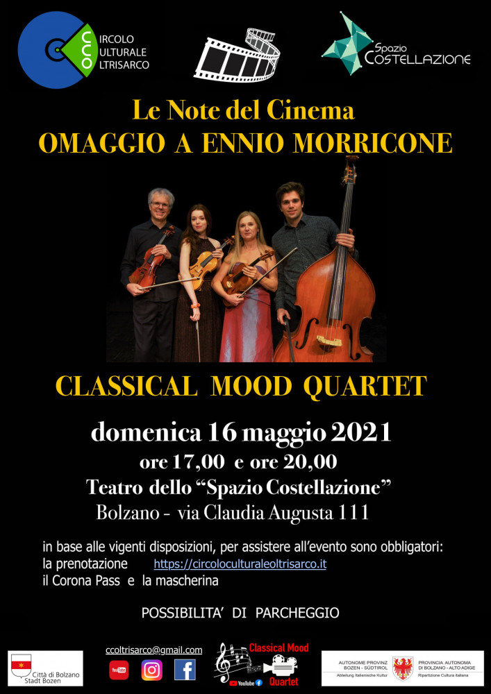 a me Finalmente possiamo riaprire il nostro bel teatro chiuso ormai da troppo tempo … In questo lungo periodo non ci siamo però persi d’animo ed abbiamo cercato di prepararci al meglio a questa apertura, sicuramente non facile con tutte le prescrizioni previste, ma il nostro grande entusiasmo e la collaborazione di tutti ci permetteranno di godere in sicurezza di tante opportunità di musica, teatro e cultura! Come sapete, è obbligatoria la prenotazione ed in questo periodo, pur essendo una piccola realtà abbiamo lavorato per darvi la possibilità di farla online sul nostro nuovo sito……….come i grandi teatri!Iniziamo domenica 16 maggio con uno spettacolo che ci condurrà con filmati e musica attraverso le più belle ed indimenticabili colonne sonore di Ennio Morricone. Ci accompagneranno in questa esperienza i Classical Mood Quartet. Viste le limitazioni dei posti in sala nella stessa serata saranno proposti due spettacoli, alle 17.00 ed alle 20.00.Links per prenotare…ore 17.00: https://circoloculturaleoltrisarco.it/evento/classical-mood-quartet/ore 20.00: https://circoloculturaleoltrisarco.it/evento/classical-mood-quartet-ennio-morricone-ore-20-00/