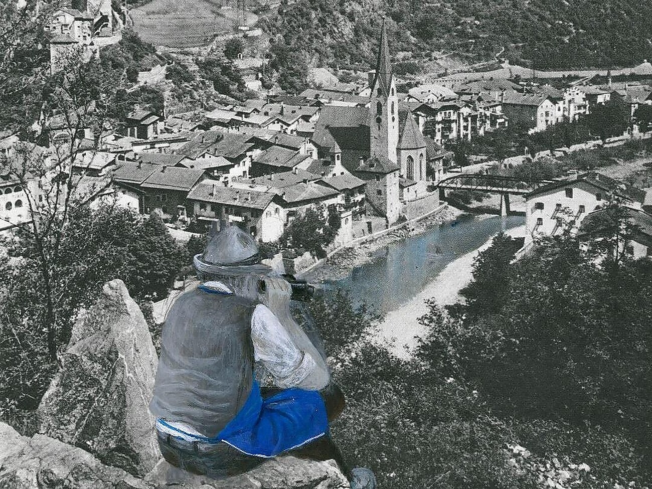 Als Bildträger verwendet sie alte Bücher und Bildbände, die sie mit Acrylfarben übermalt und anpasst, wobei sie als "blauen Faden" des aktuellen "Covid-Zyklus" den traditionellen "Firtig" einsetzt, den blauen Schurz, der zum identitätsstiftenden Ausstattungsstück der Südtiroler Männer-Alltagskultur geworden ist. (Markus Lobis)