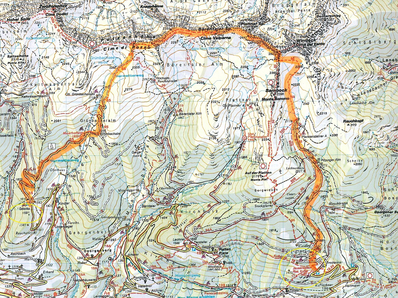 Achtung: Die Straße nach Platten ist wegen Arbeiten gesperrt! Das Mountain Shuttle fährt nach Kofl. Dort beginnt der Wanderweg Mark. Nr. 68 über die Pitzinger Alm, weiter unter dem Windeck auf dem Pfunderer Höhenweg auf den Plattner Spitz, Bärentaler Spitz, Putzenhöhe, vorbei an der Moarhofalm zum Parkplatz Gelenke.