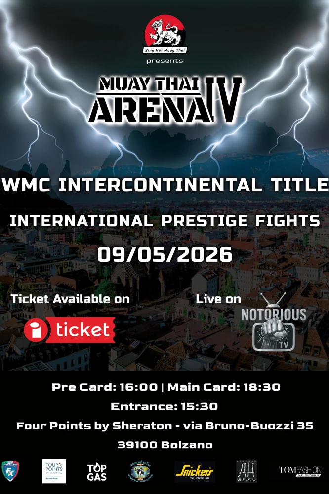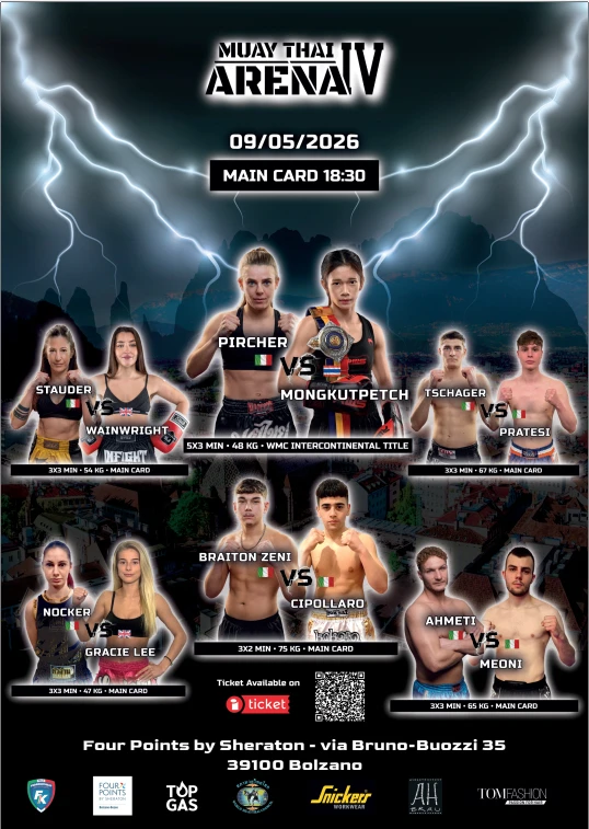Tickets online erhältlich unter: https://www.i-ticket.it/eventi/muay-thai-arena-sheraton-bolzano-2026-biglietti