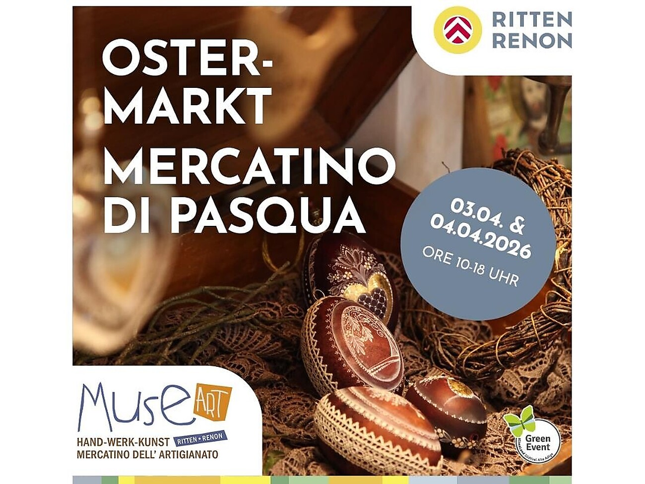 MuseArt – die Gemeinschaft von Künstlerinnen und Künstlern – lädt zum Kunst- und Handwerkermarkt im Park beim Hotel Bemelmans-Post in Klobenstein ein. Geöffnet von 10 bis 18 Uhr, mit Livemusik. Bei schlechter Witterung findet der Ostermarkt im Vereinshaus Oberbozen statt.