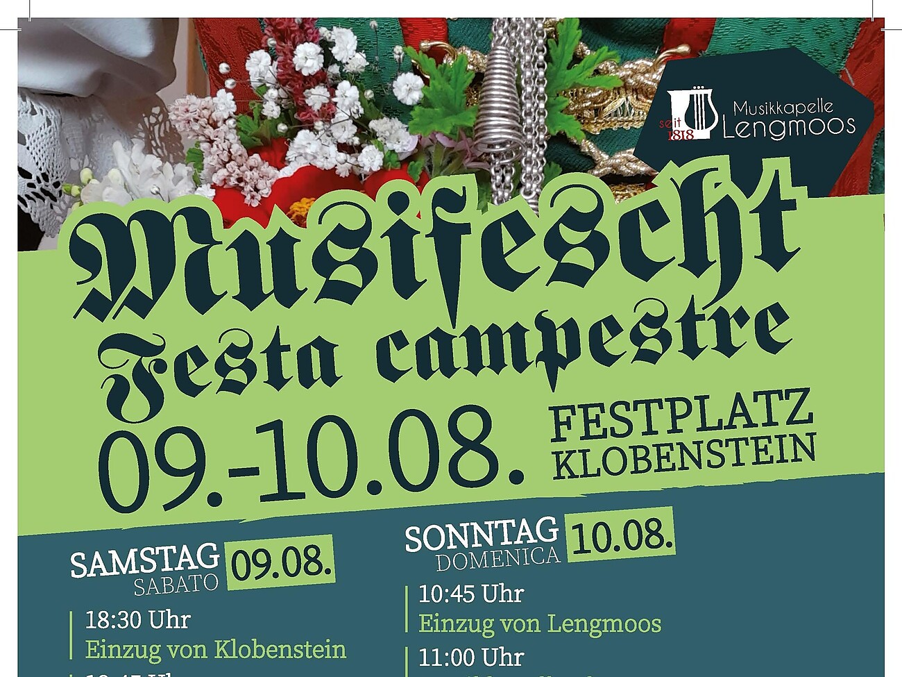 Samstag ab 18.30 Uhr: Einzug der Musikkapelle von Klobenstein zum Festplatz, anschließend musikalische Unterhaltung & Tanz.
