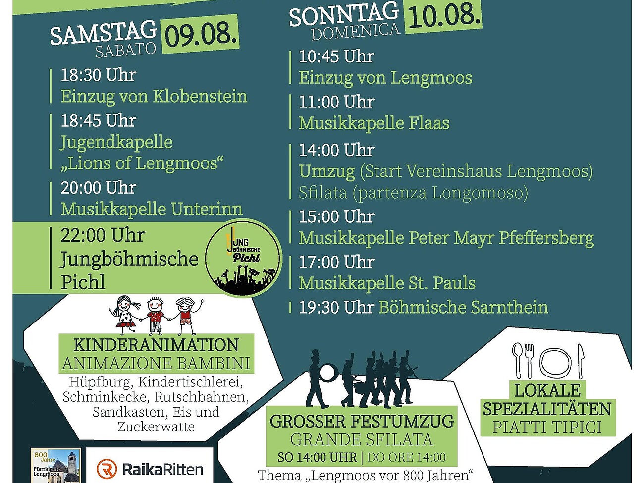 Sonntag: Einzug um 10.45 Uhr von Lengmoos zum Festplatz Klobenstein, Festbetrieb und Festumzug um 14 Uhr (Start: Vereinshaus Lengmoos).