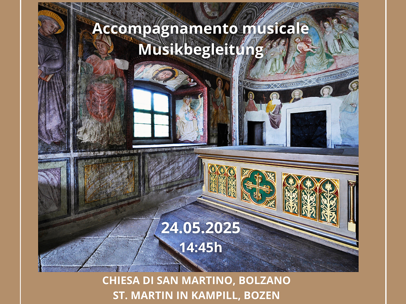 Die Besichtigung wertvoller antiker Kirchen, Schätze aus dem Bozner Mittelalter, wird durch die Stimmung von alter und moderner geistlicher “a cappella”- Musik umrahmt.