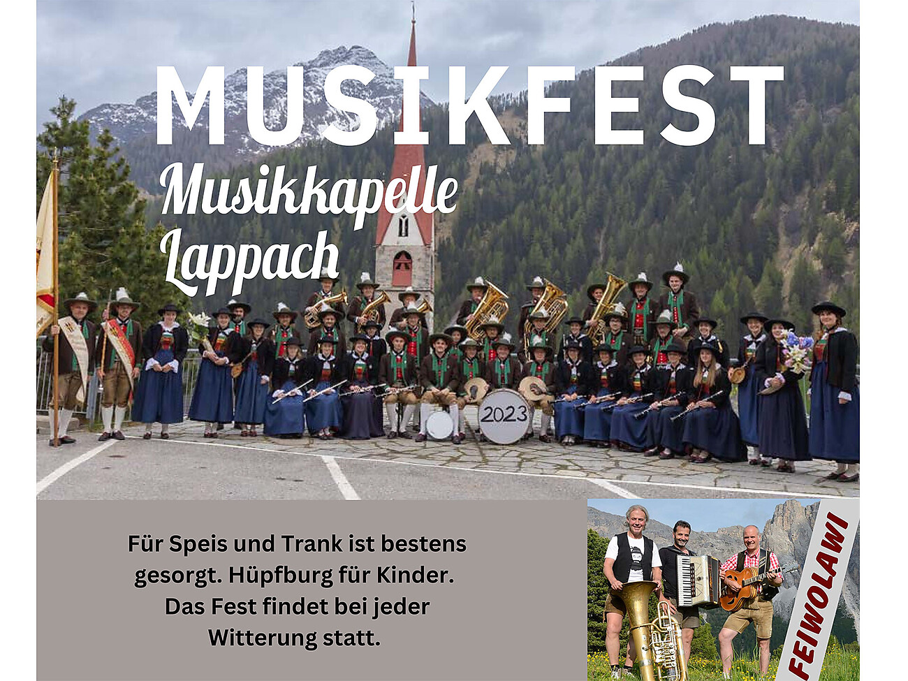 Erleben Sie am Sonntag, den 24. August 2025 ein unvergessliches Fest voller Musik, Geselligkeit und Tradition inmitten der beeindruckenden Bergkulisse von Lappach. Die Musikkapelle Lappach lädt herzlich zum diesjährigen Musikfest ein – ein Tag für die ganze Familie.