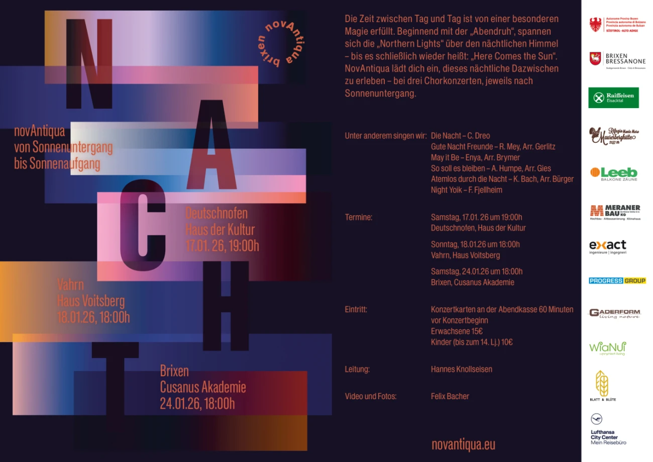 Veranstalter: Chor novAntiqua brixenKurzbeschreibung: Die Zeit zwischen Tag und Tag ist von einer besonderen Magie erfüllt. Beginnend mit der „Abendruh“, spannen sich die „Northern Lights“ über den nächtlichen Himmel - bis es schließlich wieder heißt: „Here Comes the Sun“. NovAntiqua lädt dich ein, dieses nächtliche Dazwischen zu erleben – bei drei Chorkonzerten, jeweils nach Sonnenuntergang.