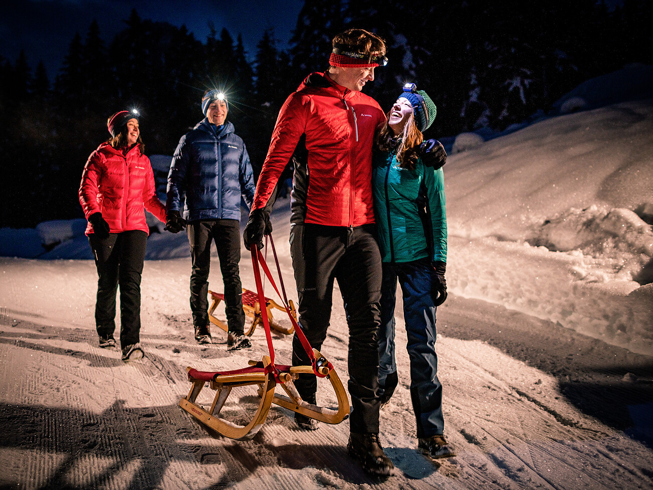 Im Preis inbegriffen: Guide, 3 Gänge Menü (ohne Getränke), Rodelverleih, Stirnlampe, Ticket für die Bahn