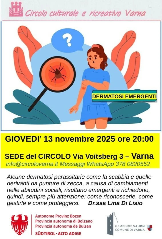 Veranstalter: Circolo culturale e ricreativo di VarnaEinige parasitäre Hauterkrankungen wie Krätze und durch Zeckenstiche verursachte Erkrankungen treten aufgrund veränderter sozialer Gewohnheiten vermehrt auf und erfordern daher immer mehr Aufmerksamkeit: Wie erkennt man sie, wie behandelt man sie und wie schützt man sich davor?