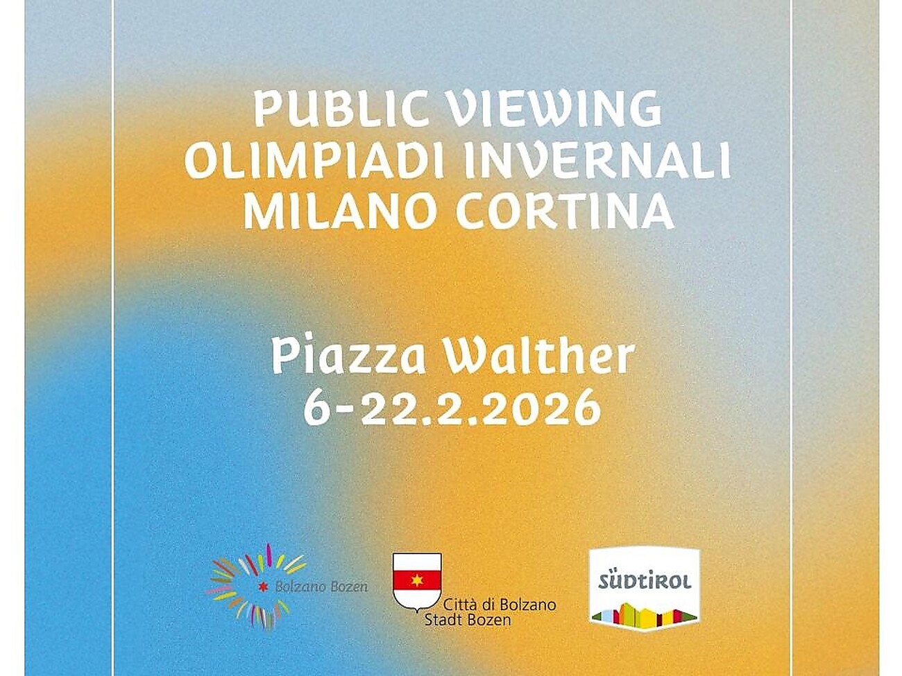 Public Viewing am Waltherplatz Vom 6. bis 22. Februar. möchte die Gemeinde Bozen in Zusammenarbeit mit dem Verkehrsamt Bozen allen Interessierten die Möglichkeit bieten, die Olympischen Spiele auf einem großen Bildschirm am Waltherplatz live zu verfolgen. Ein gemeinsames Erlebnis für Sportfans und die Gemeinschaft!