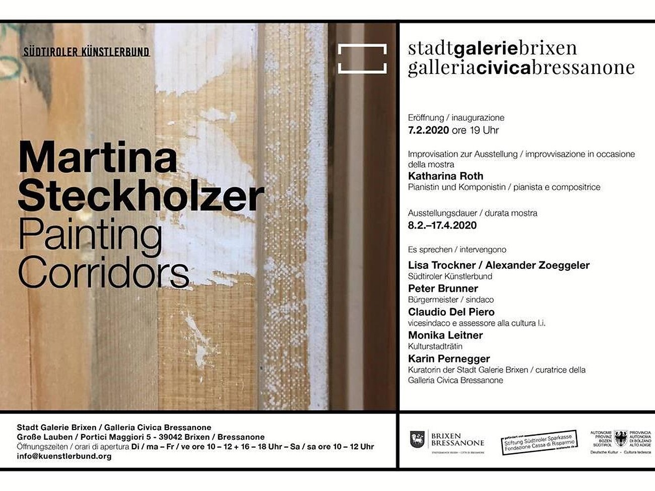 Die in Wien lebende Südtiroler Künstlerin Martina Steckholzer (1974) zeigt in der Stadtgalerie Brixen eine Raumintervention mit Malerei und Musik. Ausgangspunkt der Ausstellung PAINTING CORRIDORS ist die 7-teilige und großformatige Werkgruppe „A Lent“ (2018) die anlässlich der Eröffnung durch die in Wien und Linz lebende Komponistin und Pianistin Katharina Roth (1990) auf dem Flügel live vertont wird. Der Titel „A Lent“ ist abgeleitet von den Kompositionsangabe des verlangsamten Spiels bei Maurice Ravels weltberühmter Sonate für Violine und Violoncello „A la mémoire de Claude Debussy“. Dies belegt nicht nur die poetische Bildfindung Steckholzers zur Abstraktion, sondern auch ihren musikalischen Zugang, den sie anlässlich der Ausstellung erstmalig mit einer Rauminstallation und einer Komposition ergänzt.