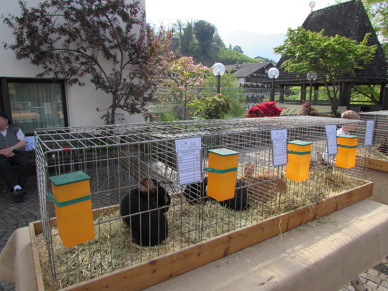 Präsentationsschau von Rassekaninchen auf dem Raiffeisenplatz Schenna