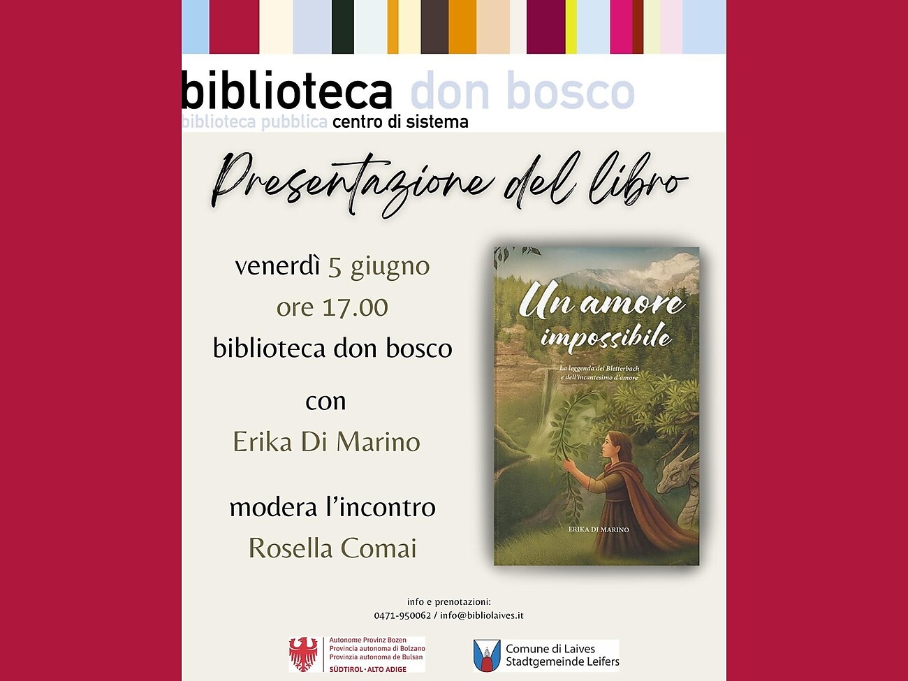 Presentazione del libro "Un amore impossibile" Venerdì 05 giugno, ore 17.00 Con l'autrice Erika Di Marino Modera l'incontro Rosella Comai Info e prenotazioni: info@bibliolaives.it; 0471 950062 Vi aspettiamo!