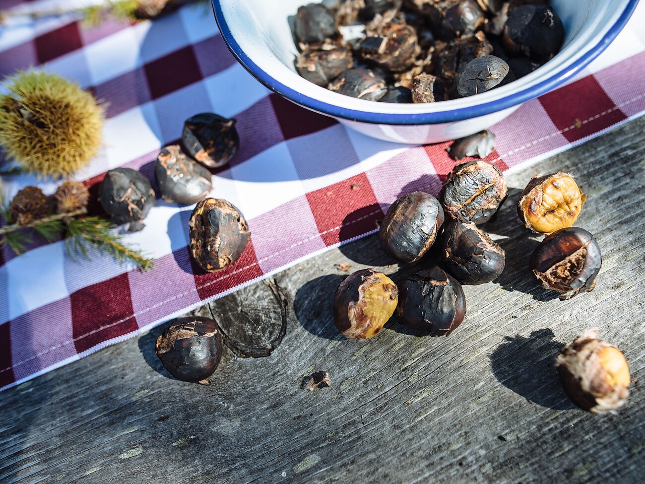 Herbstliche Köstlichkeiten wie Brettljause mit Eigenbauwein, gebratene Kastanien, Suser, Krapfen, Törggeleteller mit Schweinsschopf und Sauerkraut, Kaffee und Kuchen mit musikalischer Umrahmung.