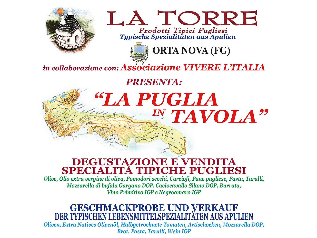 Lass dich von den kulinarischen Schätzen Apuliens verzaubern! Auf unserem Markt "Puglia in Tavola" am Rathausplatz in Sand in Taufers findest du eine große Auswahl an regionalen Produkten aus Apulien: Oliven, Extra Natives Olivenöl, Halbgetrocknete Tomaten, Artischocken, Mozzarella DOP, Brot, Pasta, Taralli, Wein und vieles mehr.