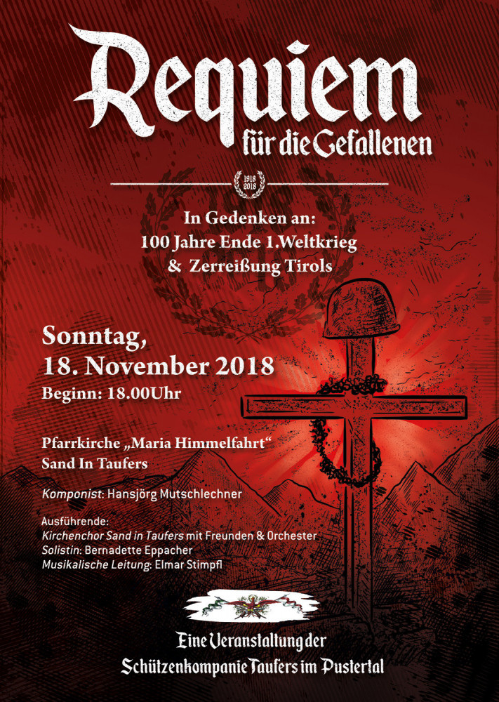 Das "REQUIEM FÜR DIE GEFALLENEN" ist ein Auftragswerk der Schützenkompanie Taufers im Pustertal an den bekannten Komponisten Hansjörg Mutschlechner. Es war den Schützen ein Anliegen, anlässlich des Gedenkjahres 2018 zu 'Hundert Jahre Ende des 1. Weltkrieges' etwas Bleibendes zu schaffen, das auch über dieses Jahr hinaus reicht. "Das Requiem ist ein in Musik gefasstes Gebet."