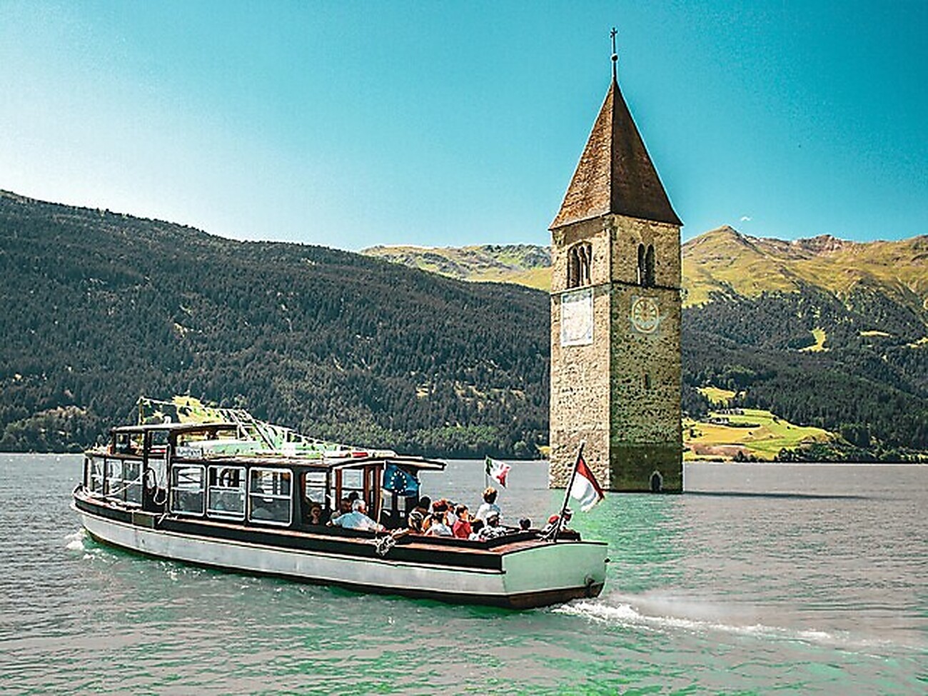 Für alle jene, die das Seenplateau Reschenpass vom Wasser aus erleben möchten: Eine Schifffahrt auf dem Reschensee mit der MS Hubertus Interregio ist ein ganz besonderes landschaftliches und kulturelles Erlebnis. Während der Schifffahrt erzählt Kapitän Winkler die Geschichte der in den Fluten versunkenen Dörfer Graun, Reschen und Arlund. Ab Mitte Juli (sofern genug Wasser im See ist) bis Oktober sticht die MS Hubertus täglich in See.