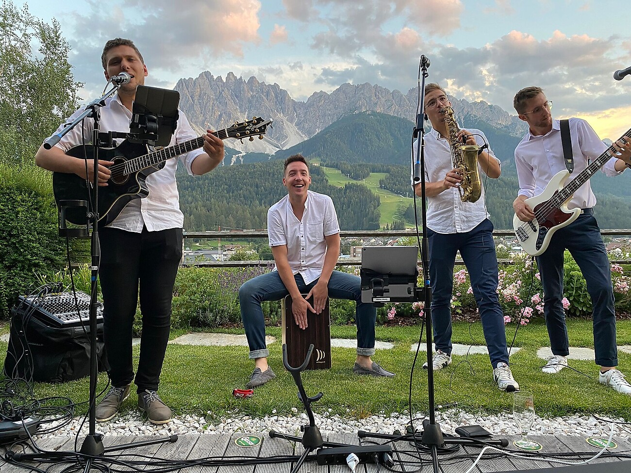 Freuen Sie sich auf stimmungsvolle Live-Musik mit Gesang und verschiedenen Instrumenten, begleitet von einem wunderschönen Panorama hoch über den Bergen von Sexten.