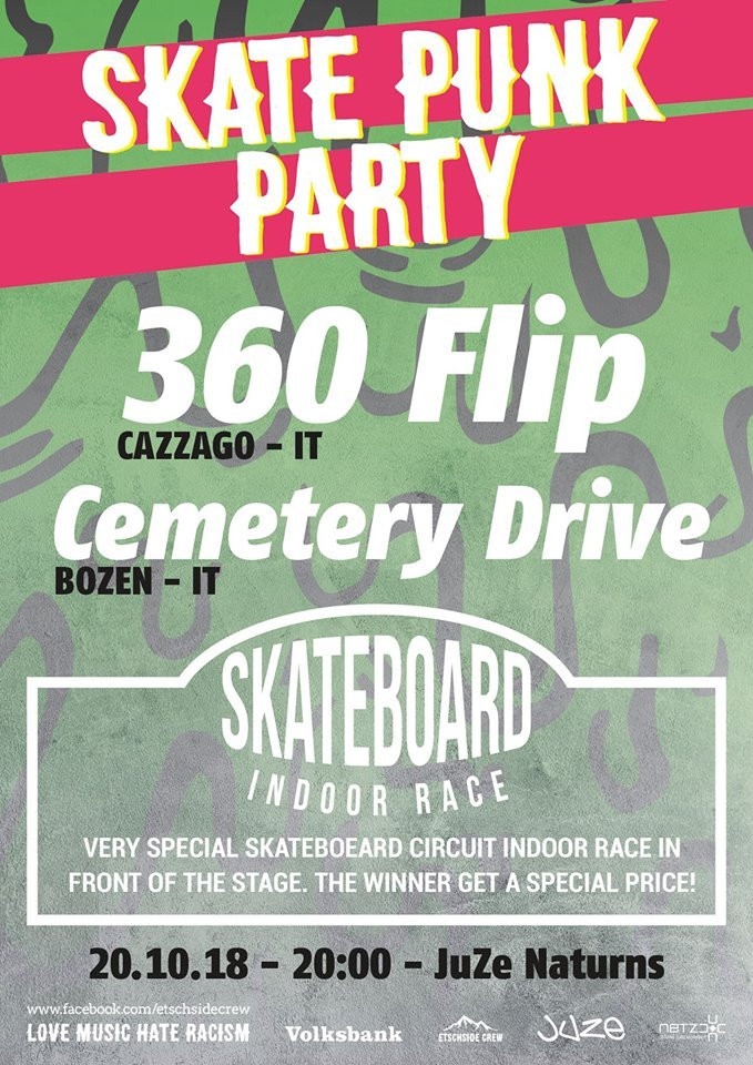 Die Punkszene lebt! 360 Flip aus Cazzago und die Locals Cemetery Drive aus Bozen sind der beste Beweis. Zwischen den beiden Auftritten gibt es diesmal ein extra Special - Vor der Bühne gibt es ein Skateboard-Indoor-Race! Skateboard also nicht vergessen! Der Gewinner erhält einen Preis
