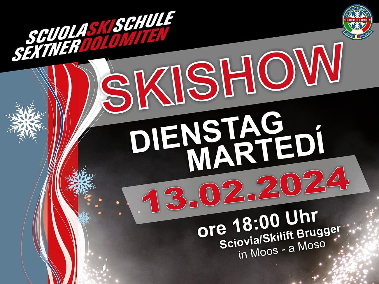 Die Sextner Ski- und Snowboardschulle lädt euch herzlich zur Skishow am Bruggerlift ein.