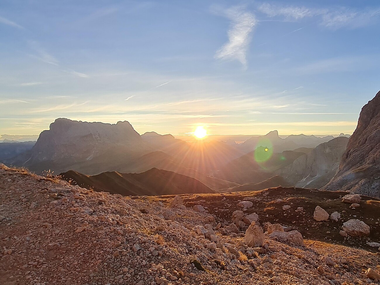 „Morgenstund hat Gold im Mund“. Spätestens, wenn man am frühen Morgen die Rosszahnscharte hoch über der Seiser Alm erreicht und die Lichtstimmung über den Dolomiten bei Sonnenaufgang erlebt, bewahrheitet sich dieser Spruch.
