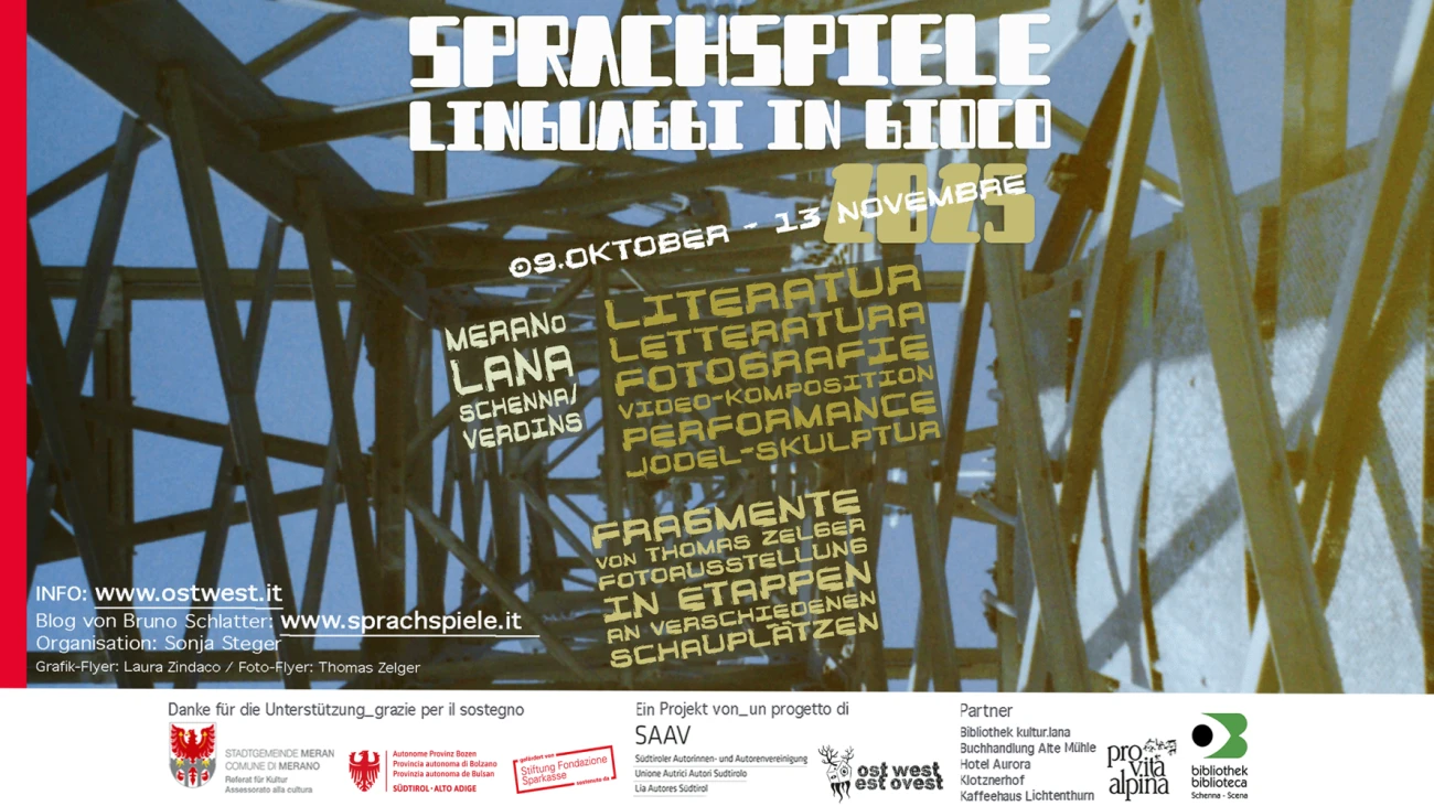 Veranstalter: Ost West Club (Neue Adresse!)Vom 9. Oktober bis zum 13. November 2025 findet die 14. Ausgabe des interdisziplinären Literaturfestivals Sprachspiele/Linguaggi in gioco in Meran, Lana und in Schenna/Verdins statt. An unterschiedlichen Schauplätzen entfaltet sich ein sprachspielerischer Dialog zwischen Publikum und Kulturschaffenden. Das Programm umfasst Buchvorstellungen, Lesungen und Gespräche, eine Jodel-Skulptur, eine Performance und eine Fotoausstellung in Etappen. Eintritt frei.