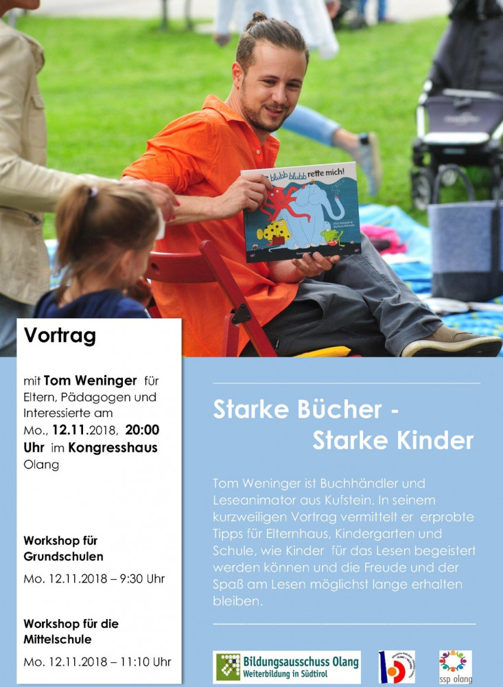 Tom Weninger ist Buchhändler und Leseanimator aus Kufstein. In seinem kurzweiligen Vortrag vermittelt er erprobte Tipps für Elternhaus, Kindergarten und Schule, wie Kinder für das Lesen begeistert werden können und die Freude und der Spaß am Lesen möglichst lange erhalten bleiben.