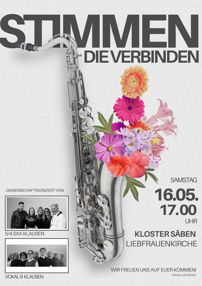 Am 16. Mai um 17:00 Uhr erwartet euch ein ganz besonderes Gemeinschaftskonzert in der Liebfrauenkirche des Klosters Säben. Freut euch auf ein abwechslungsreiches Programm – von romantischen Werken bis hin zu modernen Kompositionen. Ein Konzert voller Emotionen, Klangfarben und musikalischer Vielfalt! ✨