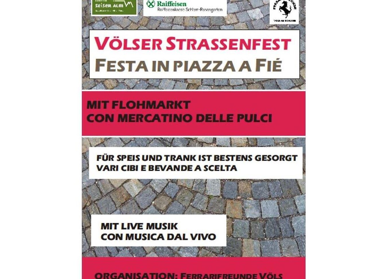 Völser Strassenfest mit kulinarischen Leckerbissen, Musik, Flohmarkt und Unterhaltung für Kinder von 18:00 bis 23:00 Uhr.