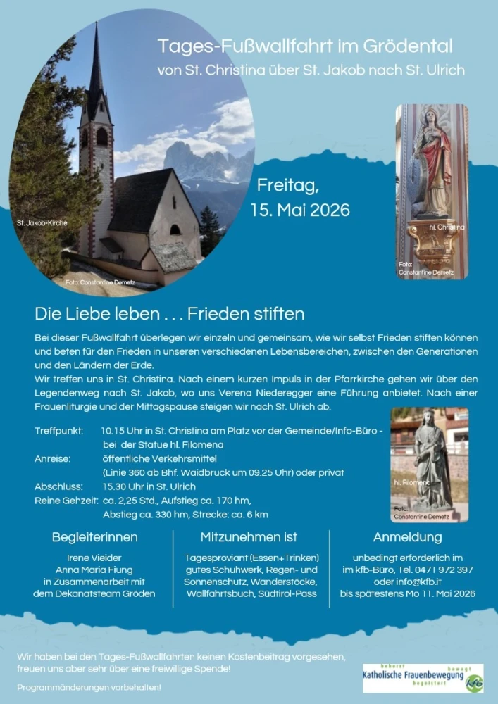 Die Liebe Leben und Frieden stiften. Bei dieser Fußwallfahrt überlegen wir einzeln und gemeinsam, wie wir selbst Frieden stiften können und beten für den Frieden.