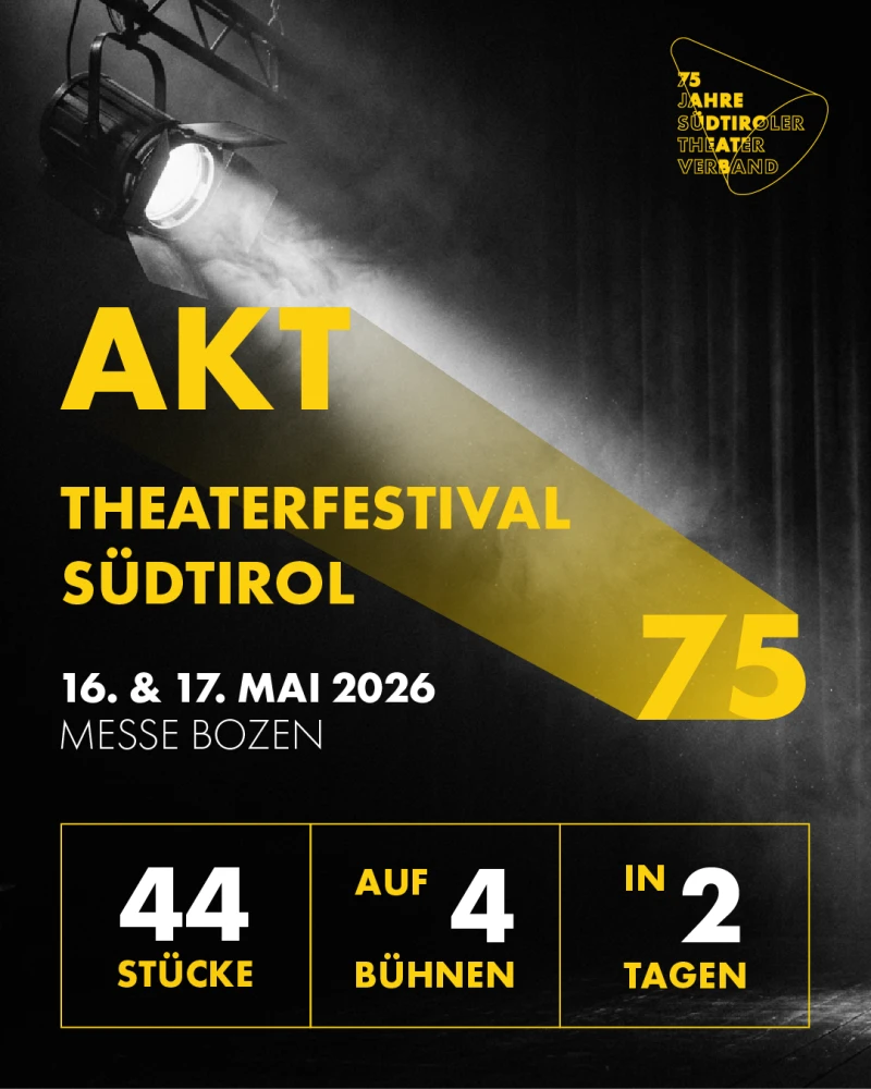 Veranstalter: Südtiroler TheaterverbandAm 16. und 17. Mai 2026 lädt der Südtiroler Theaterverband zum großen Theaterfestival „Akt 75“ in die Messe Bozen ein. Anlass ist das 75-jährige Bestehen des Verbandes – gefeiert mit einem vielfältigen, generationsübergreifenden Fest der Theaterkunst.