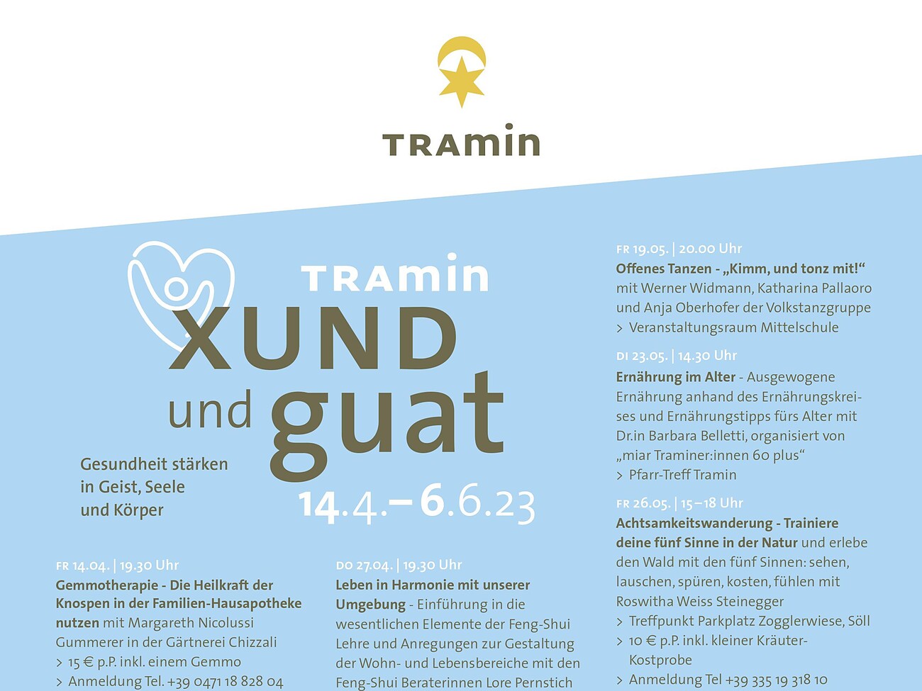 Der Titel der Veranstaltungsreihe „Tramin xund und guat – Gesundheit stärken in Geist, Seele und Körper“ beschreibt das Anliegen der Organisator:innen. Zur Gesundheit kann jede und jeder aktiv beitragen, und alles Gute, das wir erfahren oder weitergeben dürfen unterstützt uns dabei.