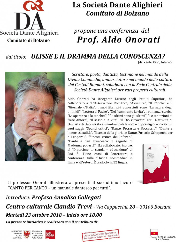 Martedì 23 ottobre alle ore 18 la Società Dante Alighieri-Comitato di Bolzano proporrà presso il Centro Trevi una conferenza di Aldo Onorati per soci e cittadinanza con entrata libera.