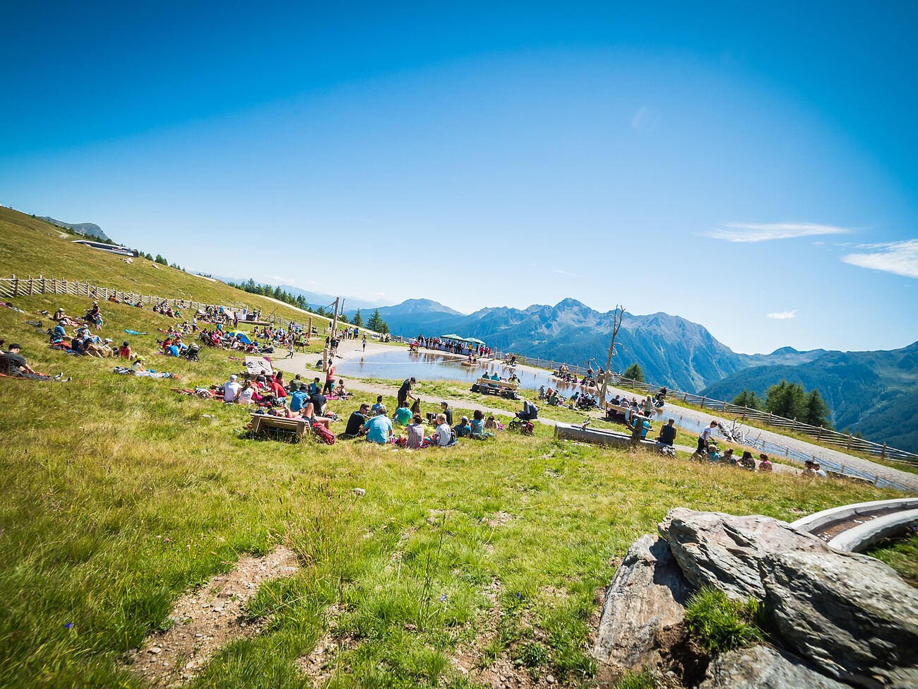 Ein spätes Frühstück am malerischen Erlebnisteich auf der Schwemmalm. Frische Almbutter, Ultner Biobrot, Kräutertees, Marmeladen von den Ultner Bauern und noch vieles mehr bietet der Ultner Bergbrunch.
