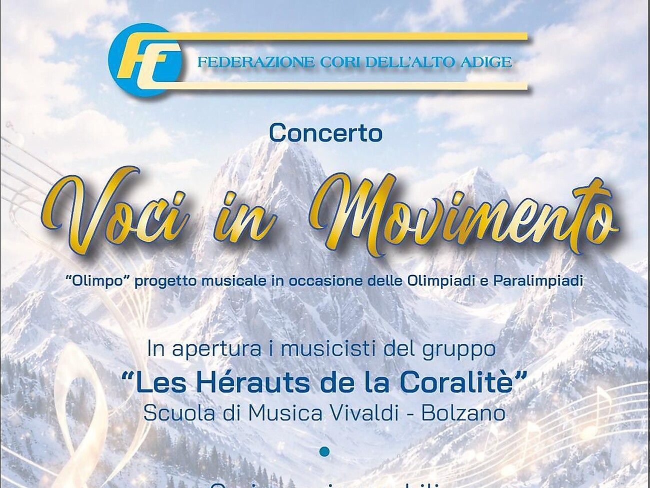 Das Konzert „Voci in Movimento“ ist Teil des Musikprojekts „Olimpo“, das anlässlich der Olympischen und Paralympischen Spiele gefördert wird, mit dem Ziel, den Chorgesang als kulturellen und gemeinschaftlichen Ausdruck zu stärken. Die Initiative wird von der Federazione Cori dell’Alto Adige organisiert und findet in einem künstlerisch besonders bedeutenden Rahmen statt.