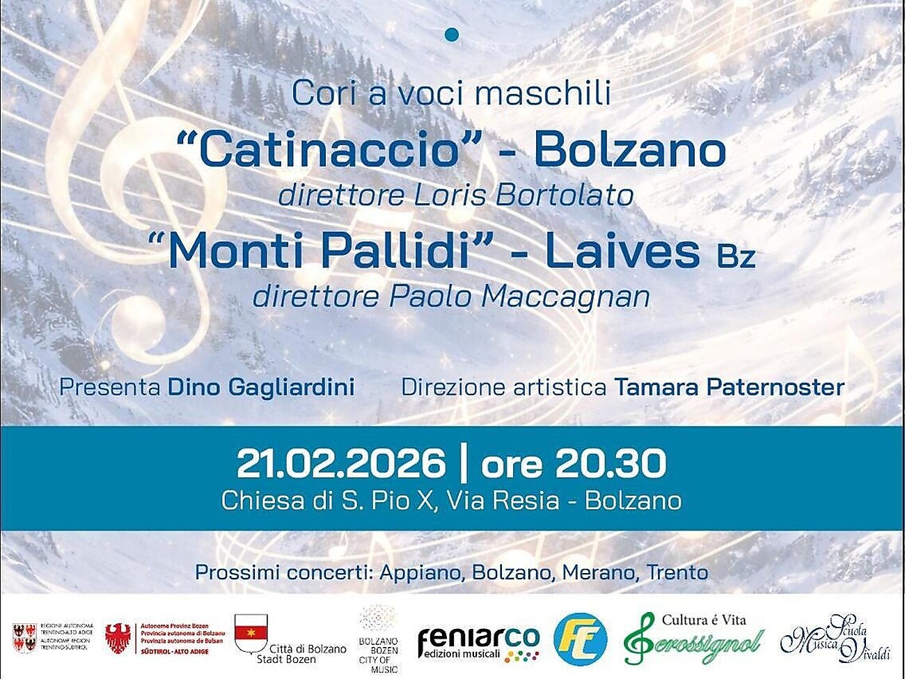 Im Mittelpunkt stehen zwei Männerchöre aus der Region: der Coro Catinaccio aus Bozen unter der Leitung von Loris Bortolato sowie der Coro Monti Pallidi aus Leifers (BZ) unter der Leitung von Paolo Maccagnan. Gemeinsam präsentieren sie ein Programm, das Tradition, stimmliche Forschung und künstlerische Zusammenarbeit vereint.