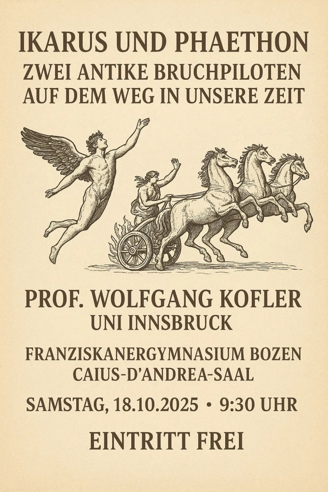 Veranstalter: Franziskanergymnasium BozenIn dem Werk Metamorphosen („Verwandlungen“) des römischen Dichters Ovid finden sich die Geschichten von Icarus und Phaëthon, zwei Jungen, die jeweils einen Flugversuch unternehmen und dabei zu Tode kommen. In unserer Erinnerung sind die beiden Figuren aber höchst lebendig geblieben: Das Motiv von Icarus, welcher der Sonne zu nahe kommt, fand den Weg in die Snowboard-Community und entwickelte sich zum Symbol für den Freiheits- und Unabhängigkeitsdrang der jungen Generation. Phaëthon hingegen, der sich von seinem Vater Helios dessen Sonnenwagen ausborgt, wurde von der Automobilwerbung aufgegriffen. Dieser Schuss ging jedoch nach hinten los…