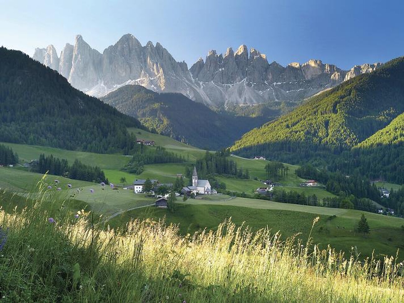 Von St. Ulrich geht es mit der Standseilbahn zur Raschötz, von dort wandern wir über die Almflächen und den Adolf-Munkel-Weg am Fuße der Geißlerspitzen zur Gschnagenhartalm und weiter bis Zans im Villnösstal.