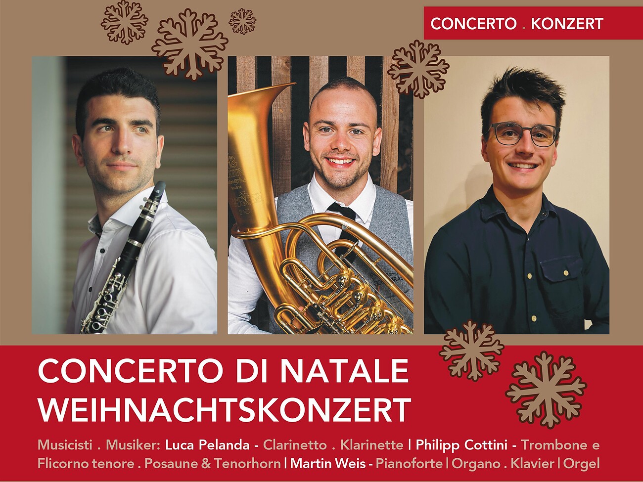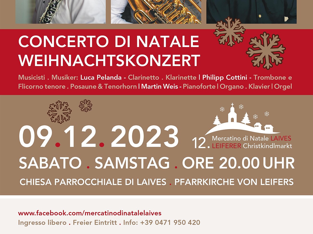 Im Rahmen des 12. Leiferer Christkindlmarktes findet in der Pfarrkirche von Leifers am Samstag, den 9. Dezember um 20 Uhr das Weihnachtskonzert der drei Leiferer Musiker Luca Pelanda (Klarinette), Philipp Cottini (Posaune & Tenorhorn) und Martin Weis (Klavier & Orgel) statt.