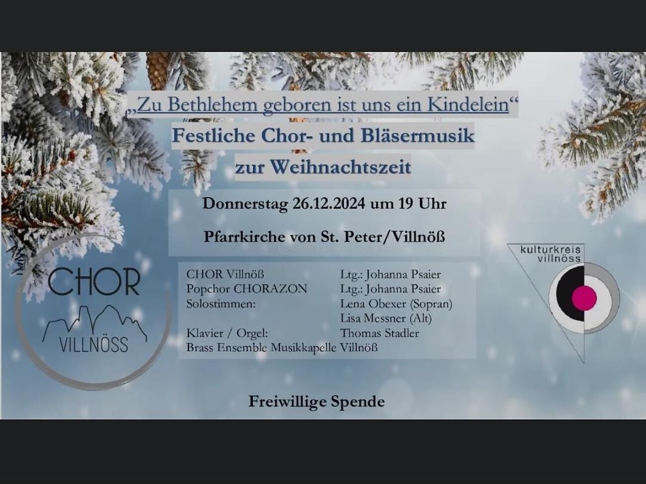 Der CHOR VILLNÖSS lädt herzlich ein zum Weihnachtskonzert am Stefanstag, 26. Dezember um 19.00 Uhr in der Pfarrkirche von St. Peter mit Musik und Gedanken zur Weihnachtszeit.