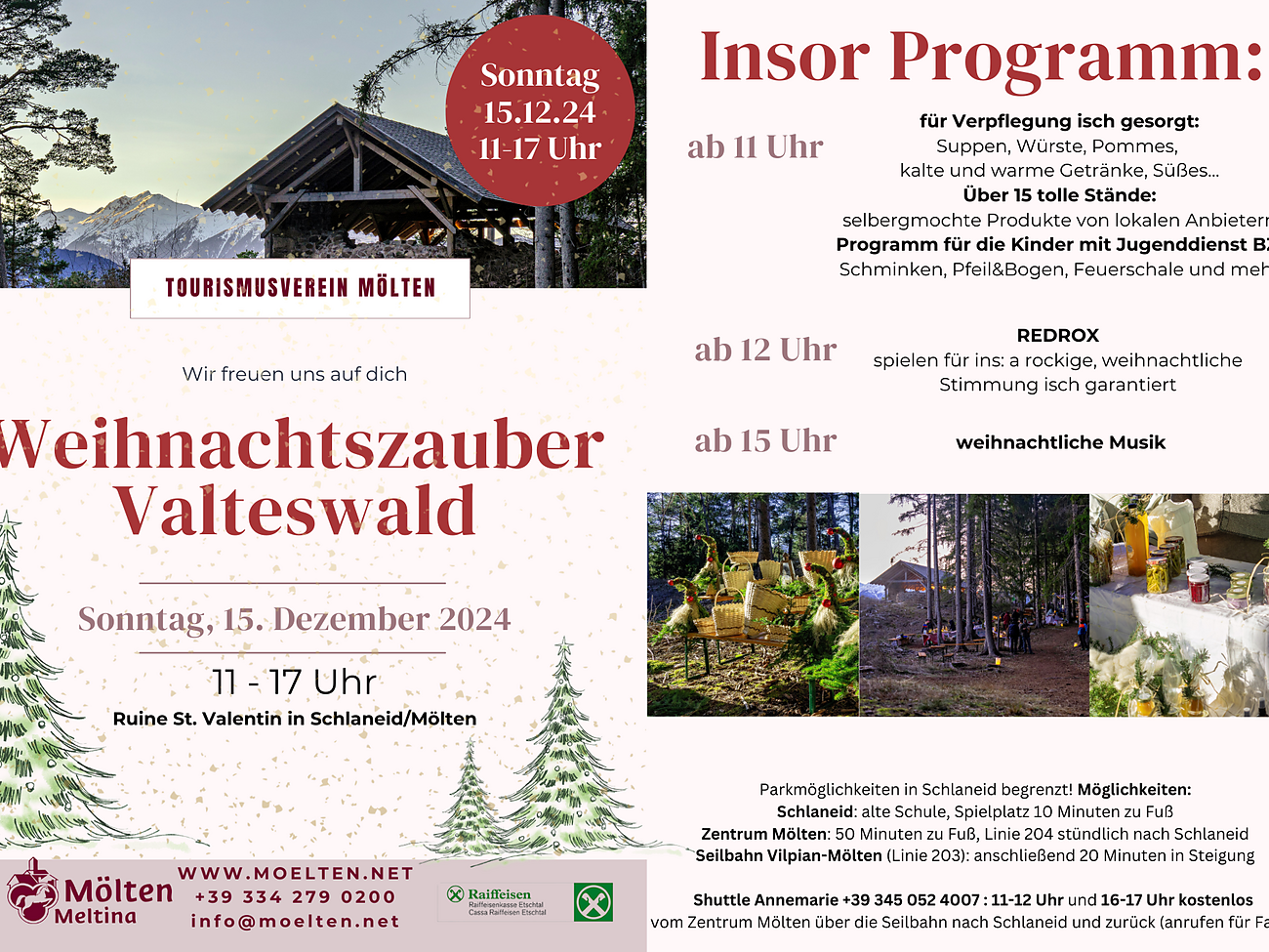 Zentrum von Mölten, Shuttle Service Annemarie Tel. +39 345 0524007 von 11-12 und von 16-17 Uhr KOSTENLOS, Busverbindung Linie 204 nach Schlaneid