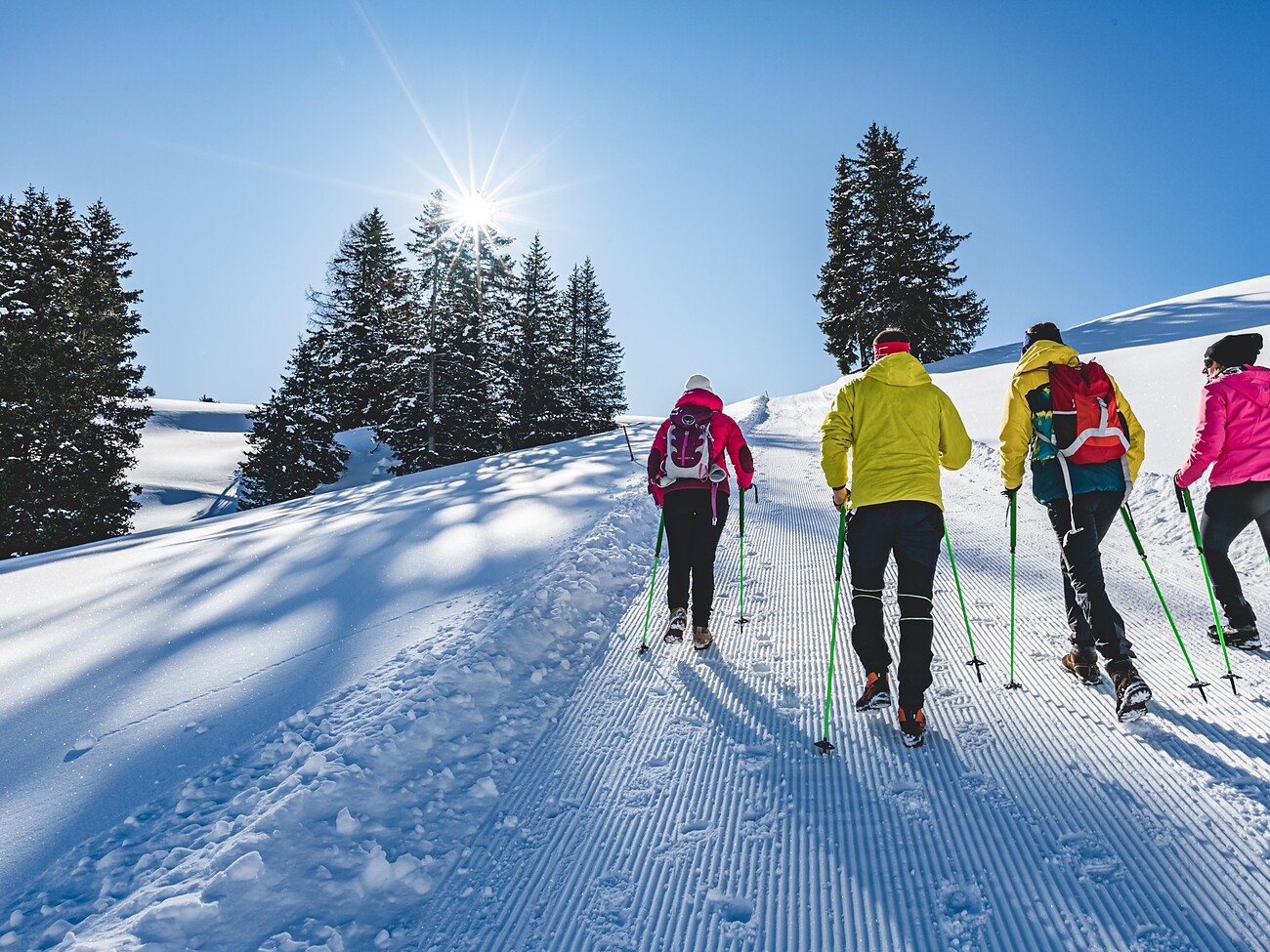 Kleidung und Ausrüstung: warme Winterkleidung, Mütze oder Stirnband, Handschuhe, hohe Winterwanderschuhe, Wanderstöcke, Grödel und Mobil Card